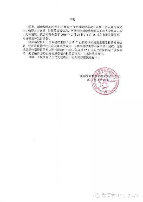 4月27日,嘉行影视公司在微博上公开发布声明,称针对旗下艺人刘恺威、杨幂夫妇的离婚传言,已发函向造谣者追究法律责任,目前,法院已受理案件,相关程序依法进行中。该声明中表示,公司于4月12日向人民法院提起了侵权诉讼,要求被告方停止侵害原告相关权益的行为,并承担法律责任。目前,人民法院已受理此案。