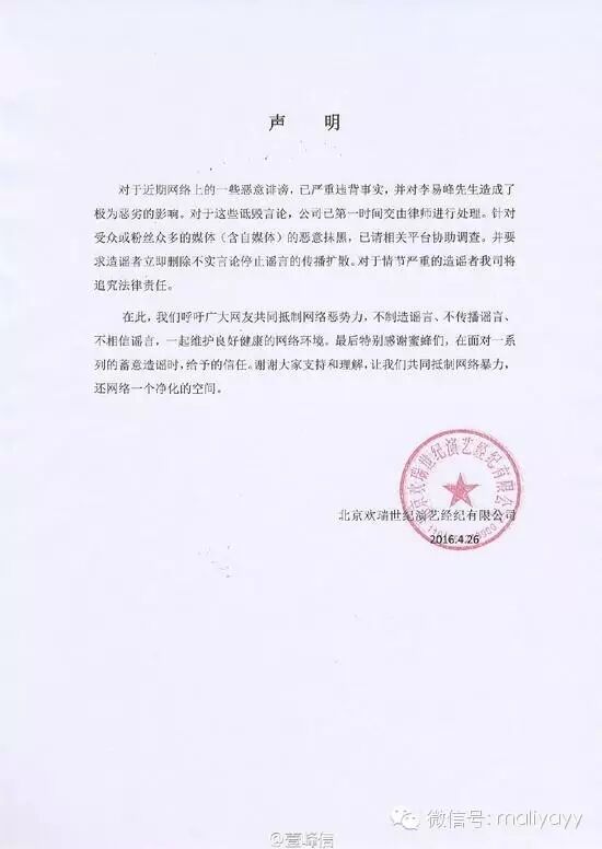当日,李易峰公司欢瑞世纪发声明,表示近期网络上的一些恶意诽谤,已严重违背事实,并对李易峰造成极其恶劣的影响。对于诋毁言论,已第一时间交由律师处理,针对受众或粉丝众多的媒体(含自媒体)的恶意抹黑,已请相关平台协助调查,要求造谣者立即删除不实言论,停止谣言的传播扩散,对于情节严重的造谣者,将追究法律责任。
