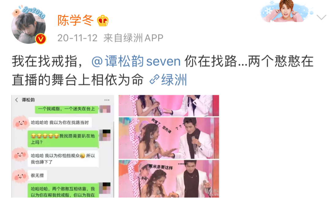 其实通过他本人的互联网冲浪行为就能发现他很有趣,就连平时不会特意关注娱乐圈的朋友都跟我说,陈学冬的微博有点搞笑。