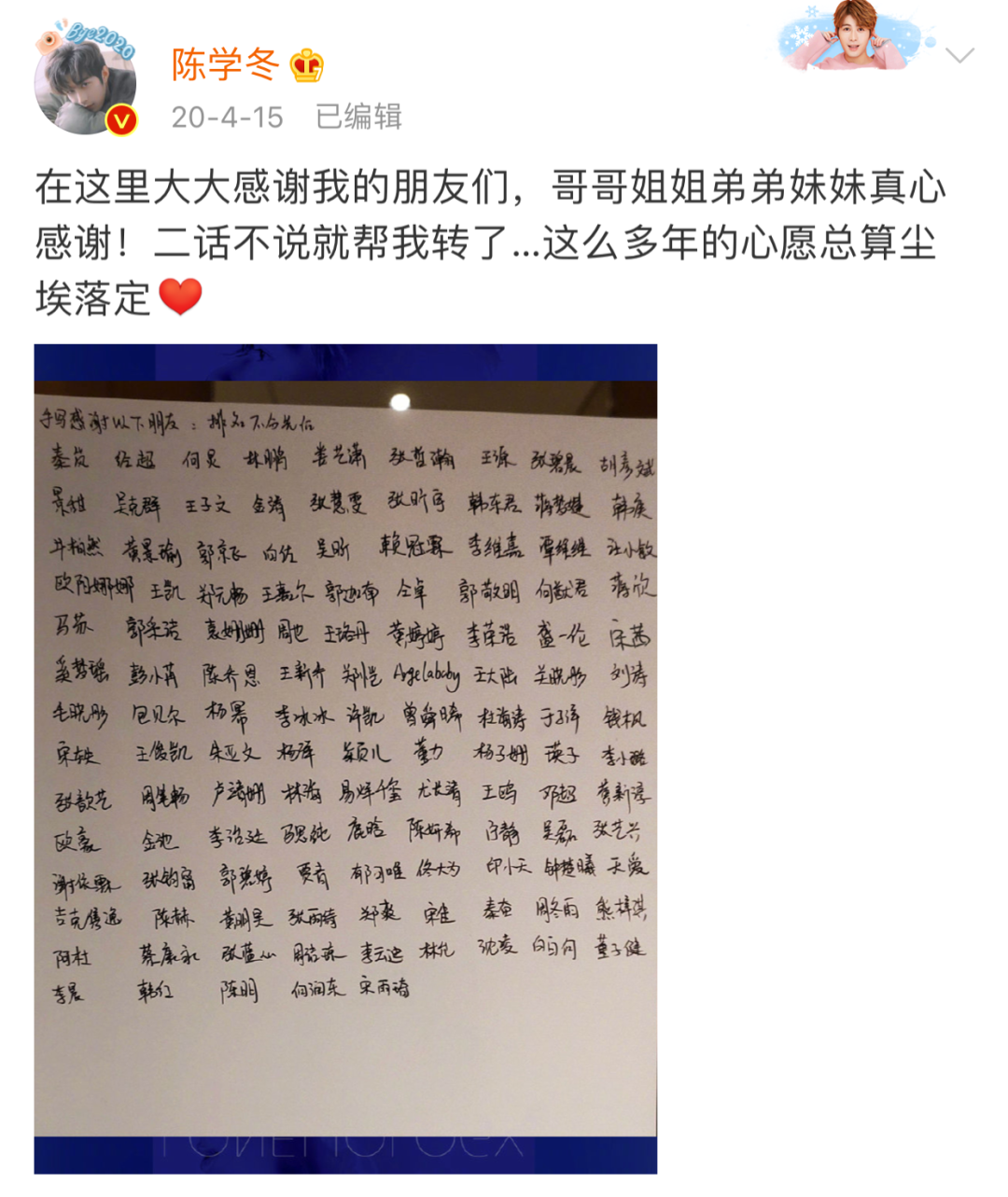 其实他唱歌很好听,正儿八经上海音乐学院音乐剧专业毕业的。去年出新歌的时候,大半个娱乐圈都转发了,他还手写了一份感谢名单 ,真·娱乐圈人脉王。