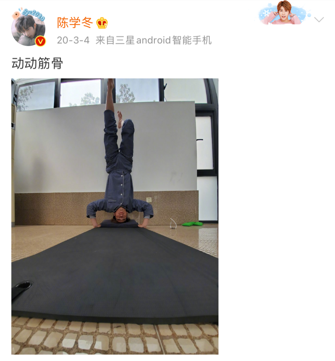 他是那种,在家就可以把日子过成段子的人。3月份闲的没事儿活动筋骨练倒立,看上去怪励志的——