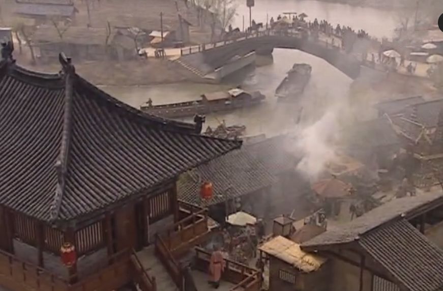 剧组还特意选取《清明上河图》中最精彩的舟过虹桥一段,加以模拟,用实物现场再现,人声鼎沸之中,观众便不由自主地走进北宋的东京城。又如宋江题诗时,酒店墙壁并非一片雪白,而是已有不少墨迹留存,足见宋朝时题壁已成风习传统,宋江附庸风雅大书其诗的行为也不突兀。
