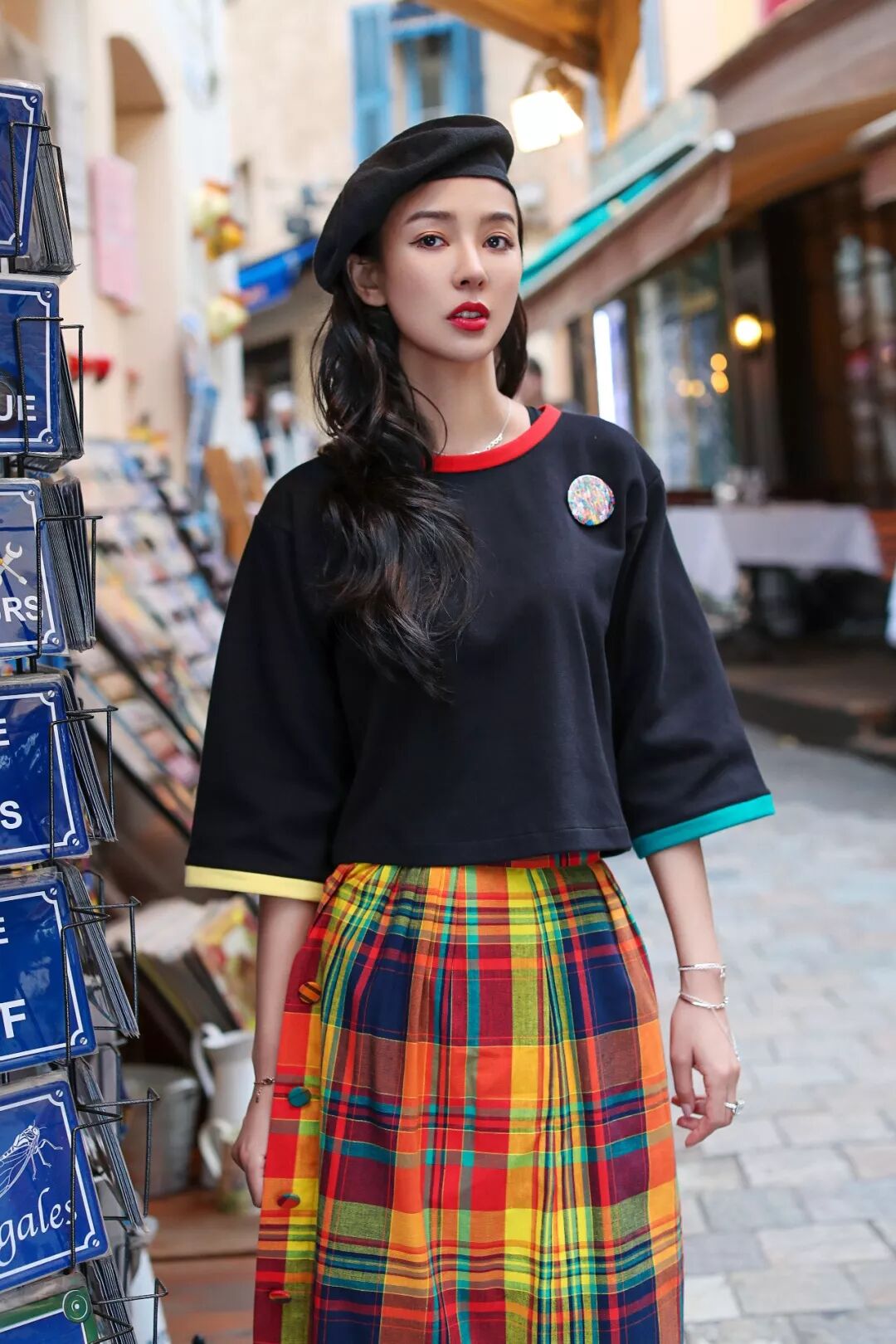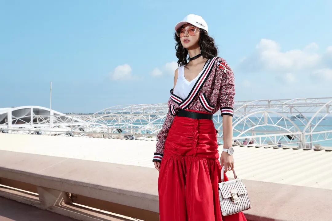 富有艺术感的线条和黄绿撞色的设计巧妙组合成异域交响曲,搭配层次感的百褶裙活力清新又与戛纳的风光氛围融合。戴上时下走在潮流前端的报童帽,又多了一份俏皮感。