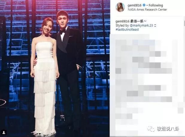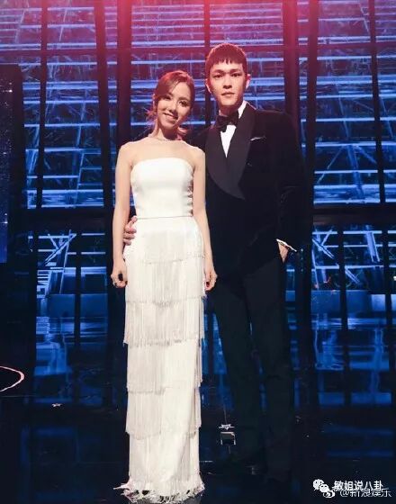照片里邓紫棋一身白色,男友mark穿黑色西装,绅士的搂着邓紫棋的腰,邓紫棋也小女生的把头偏向男友,舞台上的两个人看着十分登对啊!