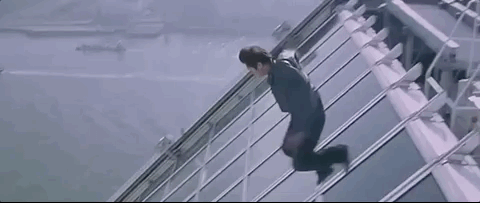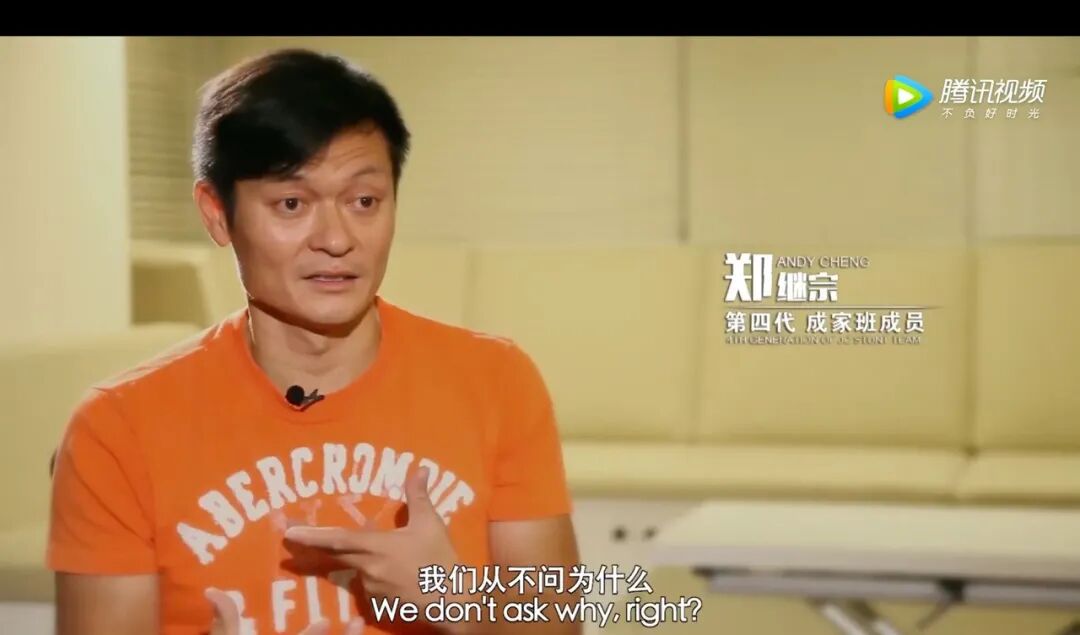 几年后拍《A计划》,需要从楼上跳下来,他徘徊犹豫了七天做心理准备,直到洪金宝过来,飙了脏话:“你他妈到底跳不跳?全剧组等着你,*&%%$#”,又旧伤复发,