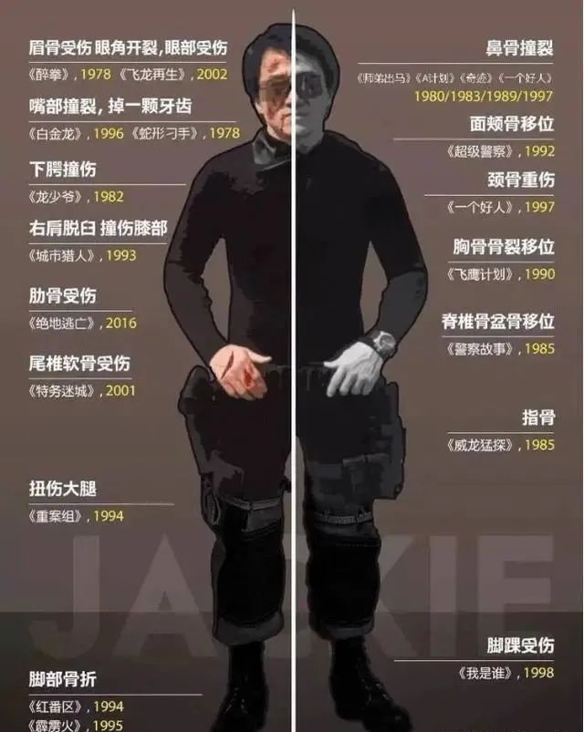 而在成龙大哥的职业生涯当中,他因拍戏留下的伤患更是几乎遍布全身,大大小小多达十几处。