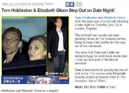 抖森Tom Hiddleston跟猩红女巫Elizabeth Olsen当地时间7月23日被拍到一起了哦