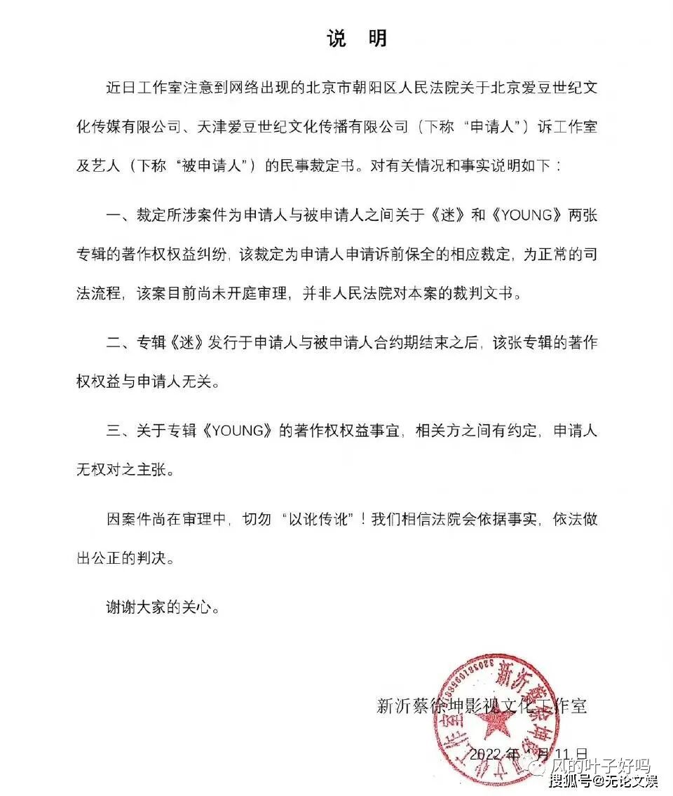 对此,蔡徐坤方面也于今日及时作出了回应,据蔡徐坤工作室发文回应称,此次资产冻结是由于蔡徐坤与其原来的经纪公司“北京爱豆世纪文化传媒有限公司”关于《迷》和《YOUNG》两张音乐专辑的版权纠纷,并且是蔡徐坤方面为了诉前保全而主动进行的合法申请。