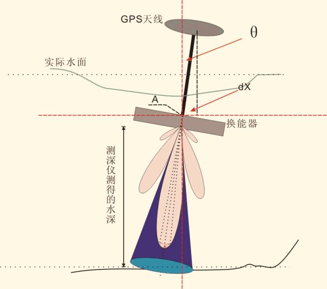 如前所述,由于测深仪的换能器摇摆角度<4°为佳,因此,理应α<4°且β<4°,假设换能器的固定杆长为2m,那么dx<0.14m,dY<0.14m。由于通常使用的信标机的平面定位精度在亚米级范围(<0.5m),因此,在这种情况下,姿态对测量结果的平面坐标造成的影响相对较小,但如果采用RTK定位,进行高精度水深测量情况下,最好配备姿态仪,进行姿态修正。