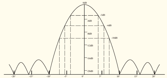 首先,我们需要了一项比较关键的技术参数指标---换能器波束角,根据无锡海鹰的HY1602型号的测深仪技术参数描述“换能器208kHz的波束角≤8°,24kHz,波束角≤22°”,那么什么是换能器的波束角呢?换能器波束角指的是发射能量衰减小于-3dB的发射带夹角,如下图所示是一个换能器的能量发射指向性直角坐标图,从图1中可以看出,换能器标称波束角度外还是有能量发射出去的,只是能量比较少。