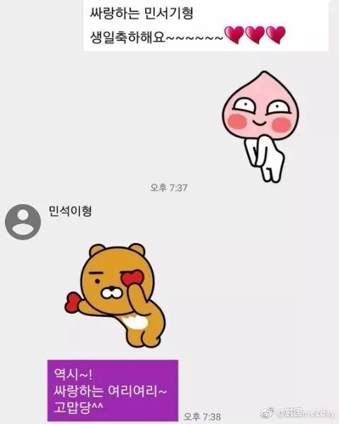 EXO成员灿烈通过个人IG公开了与成员XIUMIN的短信对话内容,截图中灿烈说道“亲爱的珉锡哥生日快乐”,XIUMIN则回答道“果然~!亲爱的烈儿烈儿~谢谢~”另外忙内世勋也更新IG表示“Happy birthday!!”并上传了一张XIUMIN的照片,展现出成员们之间暖暖的兄弟情。