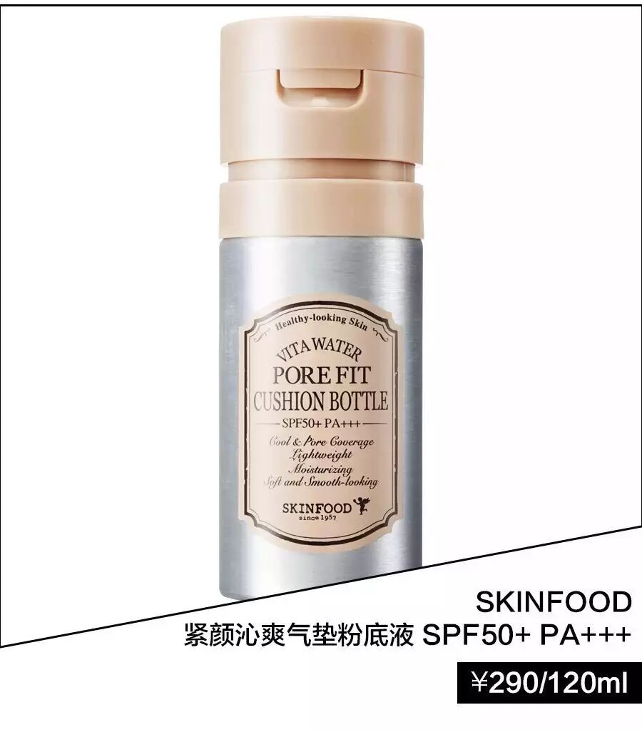 SKINFOOD紧致沁爽气垫粉底液,最大的特色是清凉的使用感能迅速为肌肤降温9度,轻薄的气溶状质地令妆感更清透自然,打造嫩滑零毛孔肌。