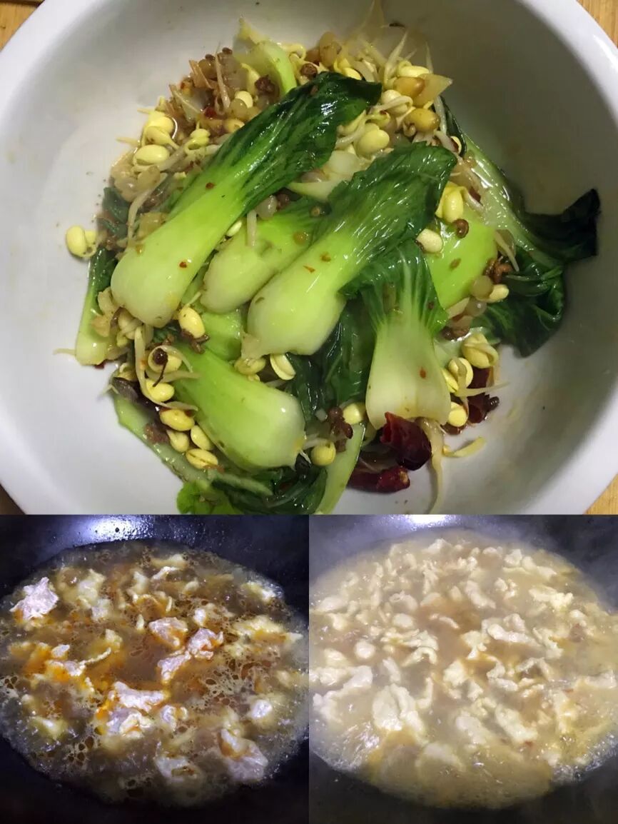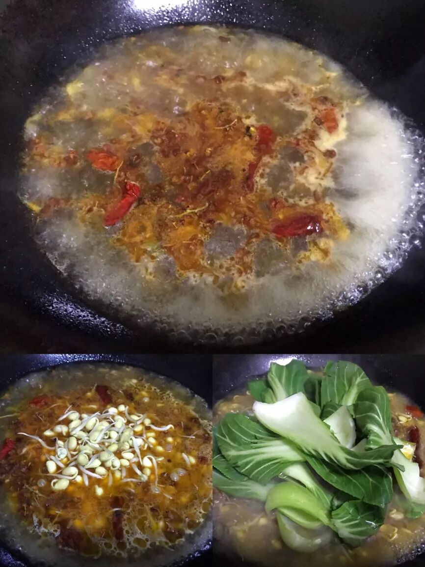 接着加入适量的开水,放入适量的盐,鸡精,3勺生抽煮开,倒入洗净的豆芽煮1—2分钟,接着倒入喜欢吃的青菜煮熟