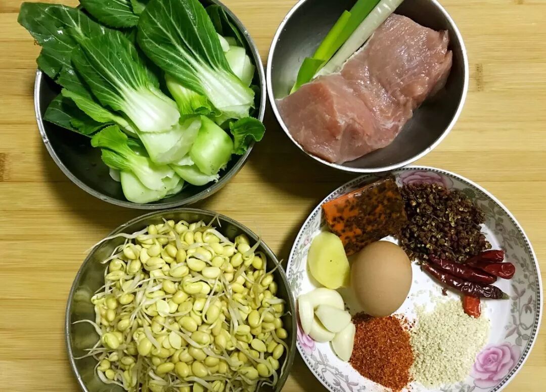 所需食材:猪里脊肉,青菜,鸡蛋,豆芽,葱,姜,蒜,花椒,干辣椒,火锅底料,辣椒碎,白芝麻,鸡精,盐,油,生抽,淀粉