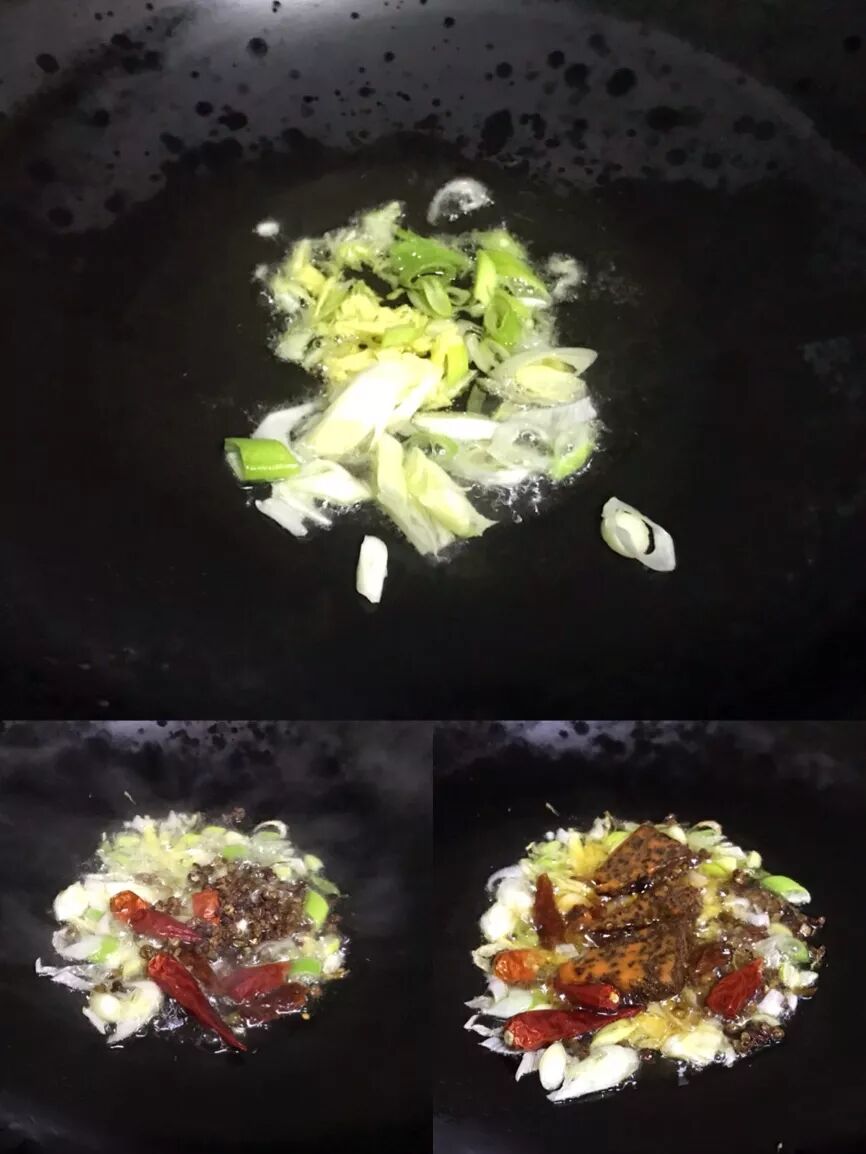 起锅烧油,倒入葱,姜,干辣椒,花椒炒香,下入火锅底料,炒出红油