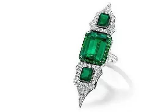 这只戒指是来自纽约华裔顶级珠宝艺术家ANNA HU,独家为那英设计的高级订制珠宝《天盾颂》。戒指上3颗近15克拉的顶级哥伦比亚祖母绿,戒指造型十分独特,两端延伸搭配白钻展开一对盾型翅膀,整体造型象征着盎然的生命力。价值约1300万元。看看这颗钻戒的价钱,搁谁谁不会紧张啊!