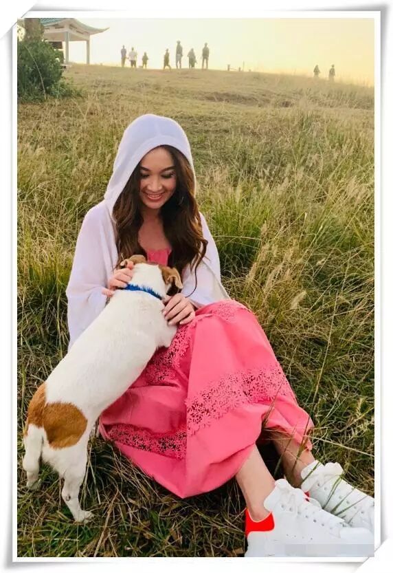 温碧霞穿了一件红粉色的长裙,外面套了一件白色的连帽外套,脚上是一双白色的休闲鞋,看起来少女文艺范十足。