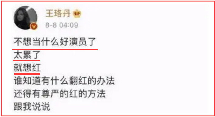 这就是王珞丹曾经的微博动态,自己发的感慨:不想当什么好演员了,太累了,就想红。