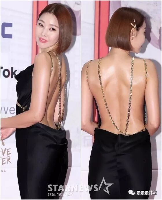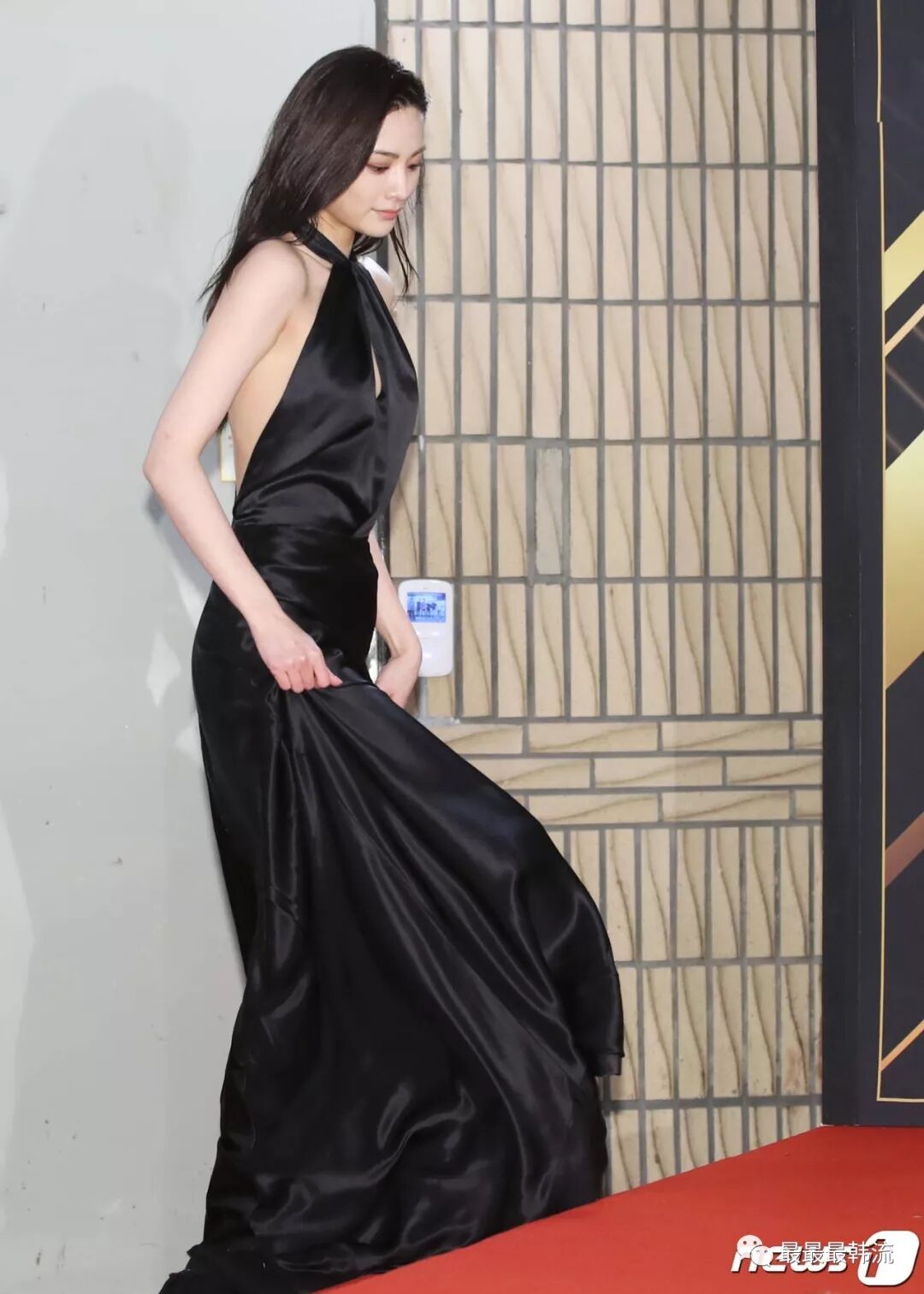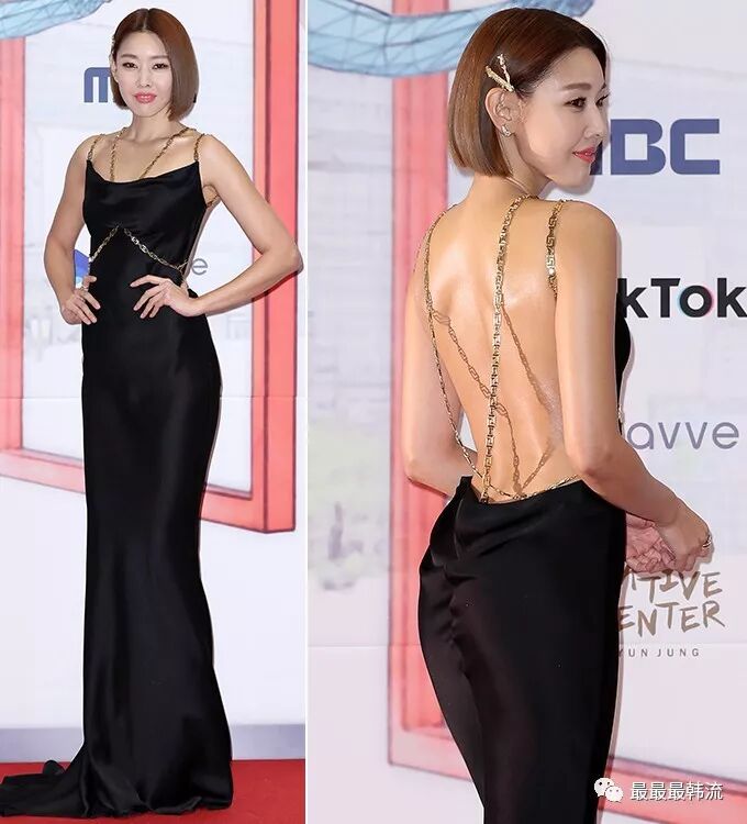 黑色丝绸吊带礼服正面看其实也就是简单的睡衣裙样式,不过贴身剪裁勾勒出韩惠珍的完美线条,但一转身就是让人喷鼻血的性感露背,高级不低俗。