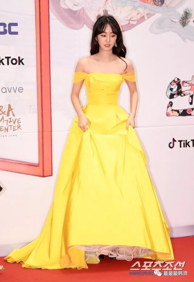 朴世婉的这身黄色礼服长裙就是与林智妍相反的正面教材,肩部一点点雪纺修饰瘦弱的胳膊,下身大裙摆平衡了单薄的上半身。裙子的颜色和版型让我想起了《美女与野兽》中的贝儿公主。