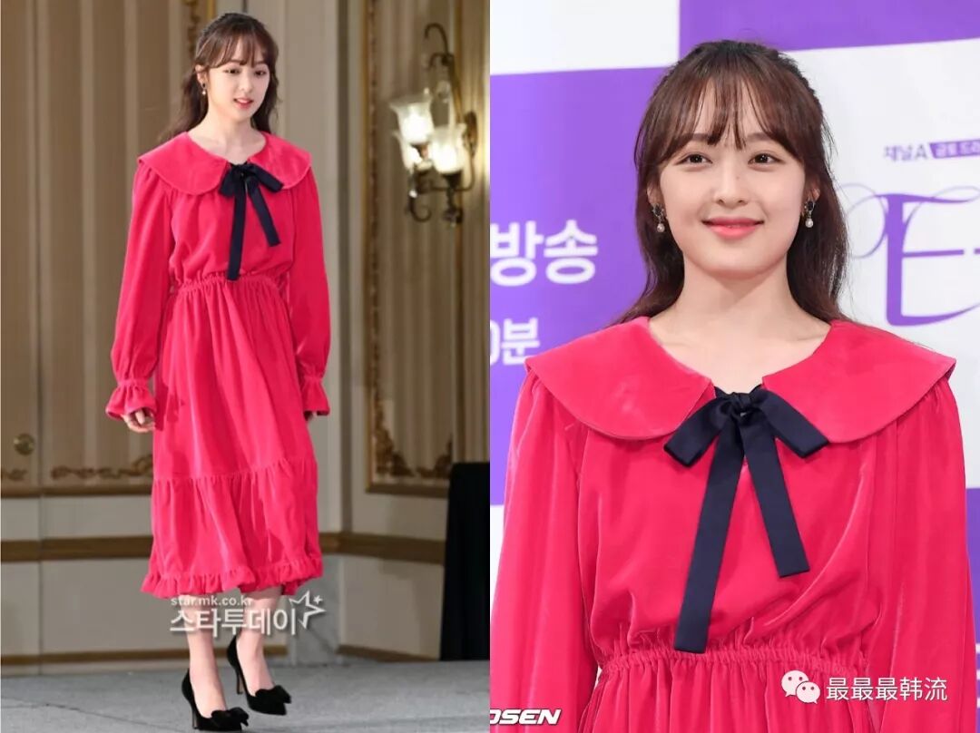 姜胜贤的裙子与其他女演员的大裙摆相比看起来就要朴素很多。最近很多韩国艺人上身的一半有一半没有的袖子设计,肩部的蝴蝶结与高跟凉鞋相呼应,有一种可爱女人的感觉。