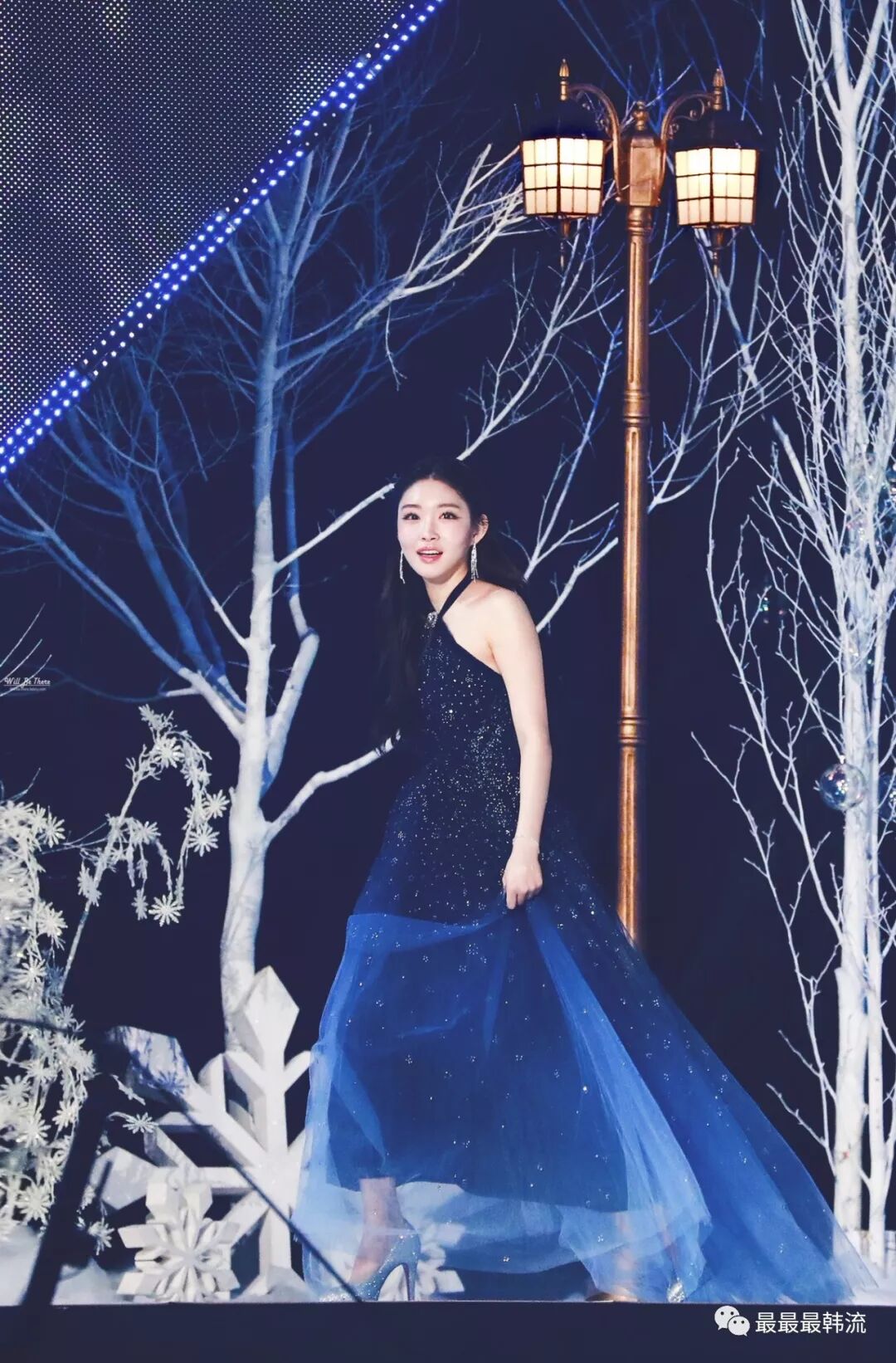 这可能是KBS这边最梦幻的一条裙子了吧,粉灰色裙身上镶满碎钻从胸口延伸到裙尾,由密集到稀疏,宛如银河一般璀璨。层叠薄纱裙摆以及装饰轻搭在肩部的围巾飘逸轻盈梦幻又仙气十足。