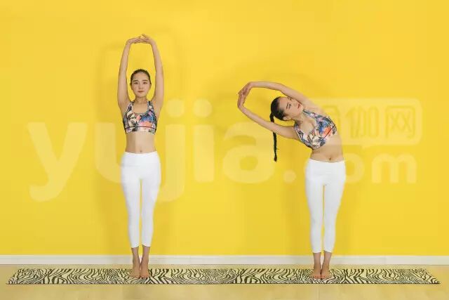 ② 慢慢吸气,右肩向上延伸,然后慢慢吐气,腰部向左弯曲,并保持脊柱挺直;然后吸气,身体慢慢还原,然后呼气腰部向右弯曲,并保持脊柱挺直,重复4~5次即可。