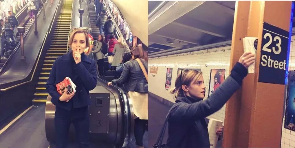 去年11月,作为她的读书俱乐部的一项活动,Emma在伦敦地铁里藏了100本书,在特朗普当选美国总统后她又去纽约地铁里藏了一回。她在Instagram上贴了自己作为“藏书忍者”的照片,“大家都忙着在玩手机,根本没人注意到我。”她说,尽管她每次离开家门时都会被大批哈利波特迷们包围。