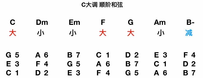 人们就把自然音阶中的7个和弦,分成以上三个功能,我们先回顾一下C大调顺阶和弦的组成音。