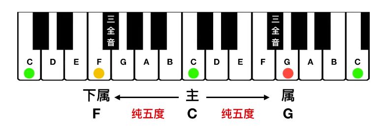 我们先看下钢琴的键盘,把C作为主音,当做定点。我们如果只研究C大调不去研究带有升降号的黑键,那F(下属音)或G(属音)就是距离主音最远的。