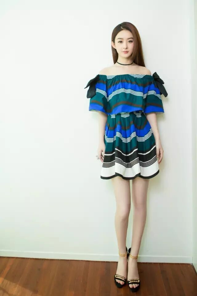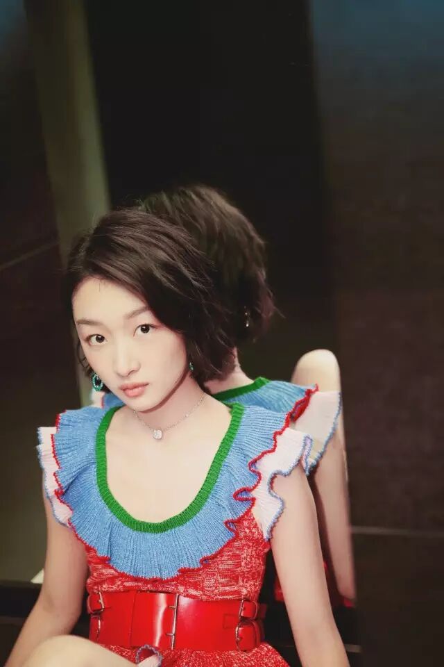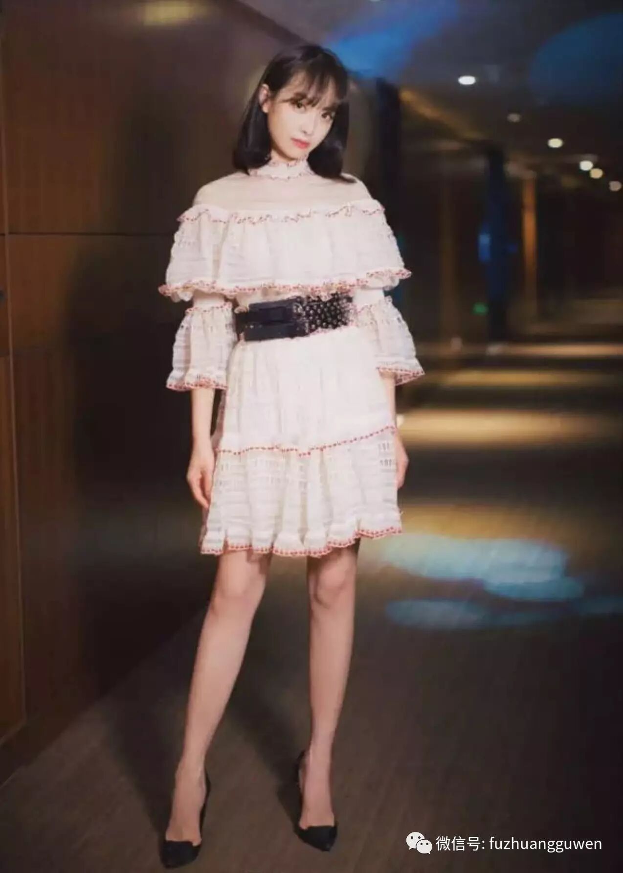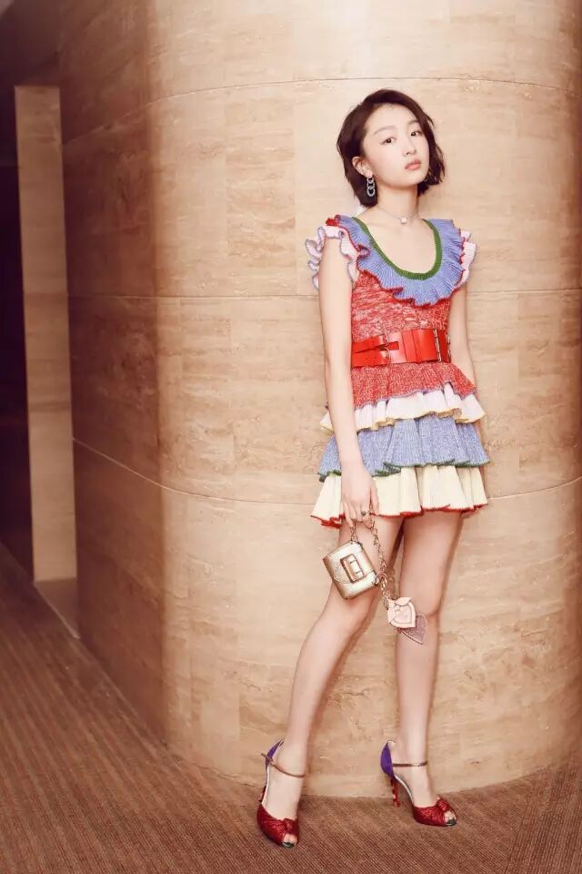 周冬雨选择了针织拼色荷叶边连衣短裙