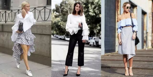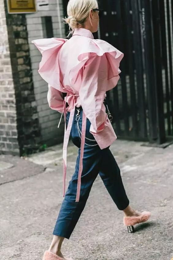 荷叶边元素单品首选衬衫~点缀在肩膀上就会显得造型感很强烈~富有VINTAGE的感觉,荷叶边属于比较繁复的单品,最好结合简约的服饰来配合~▼