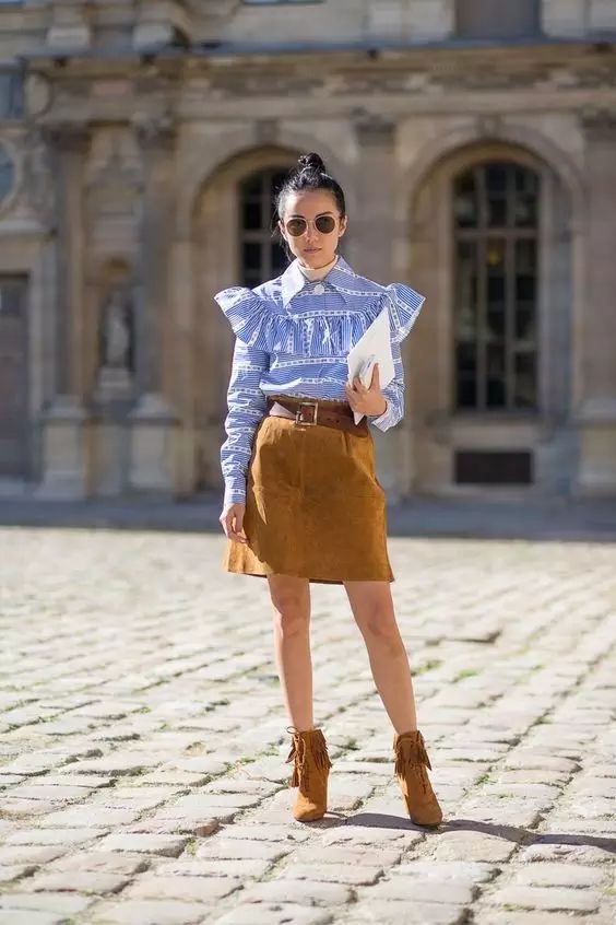 搭配短裙也是小个子女生的必学LOOK~同色系的麂皮靴让造型充满美式西部风格~▼