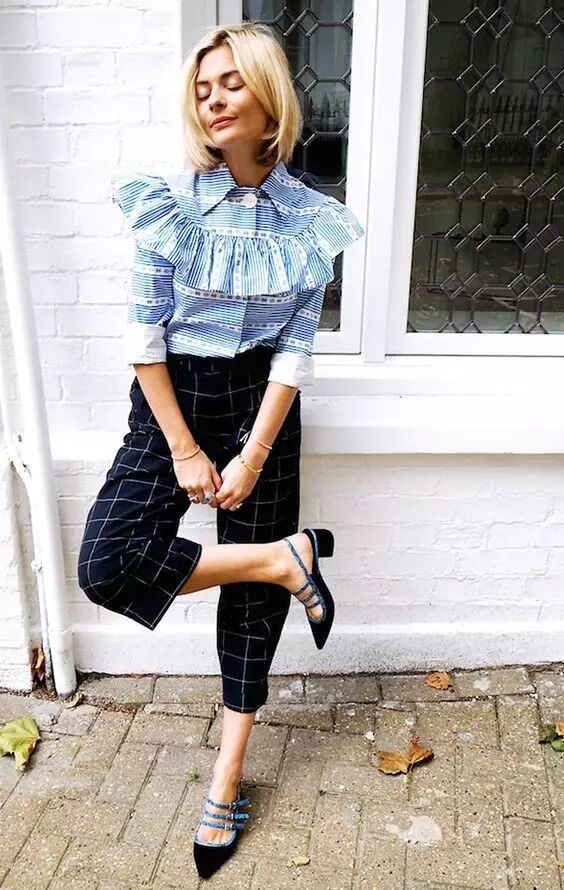 搭配带有格纹元素的阔腿裤和尖头鞋都很有个性~记得要把衬衫的下摆塞进裤子里才能显高显瘦~▼