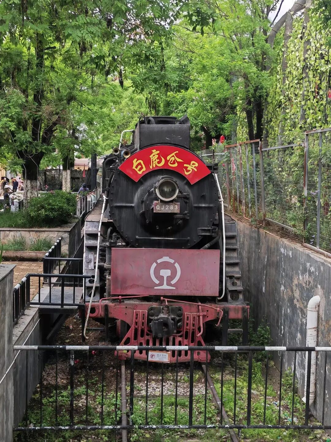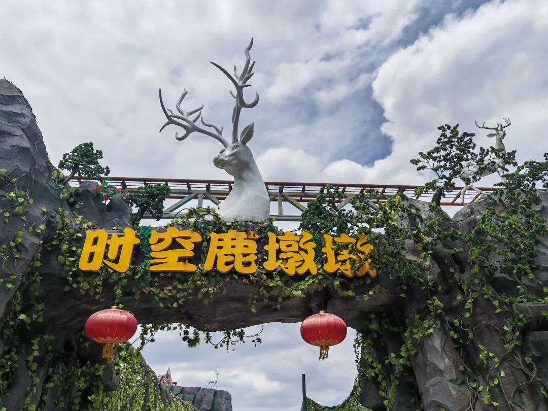 走过小桥流水,九曲回廊,迈过亭台楼阁,林立店铺,抬起头,一对漂亮的“时空鹿墩墩”高悬,它们头上佩着蓝天白云,脚下依着白鹿福地,似乎在安详地享受着自由自在的生活。转过湾,就见一列绿皮火车停在眼前,一对妙龄男女游客站在内燃机上,有女士高挽发髻,穿着旗袍,眼波流转。身边的男子穿着西装, 头戴尼帽,皮鞋铮亮。相依着似乎在展演着他们人生的奋进之戏。