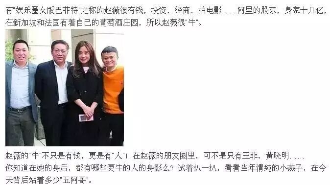 马云:赵薇跟马云关系不是一般的好啊。首先他们是商业伙伴。她凭借入股阿里影业,短时间内身价就暴涨了40多亿港元,成功套现后净赚10亿港元。
