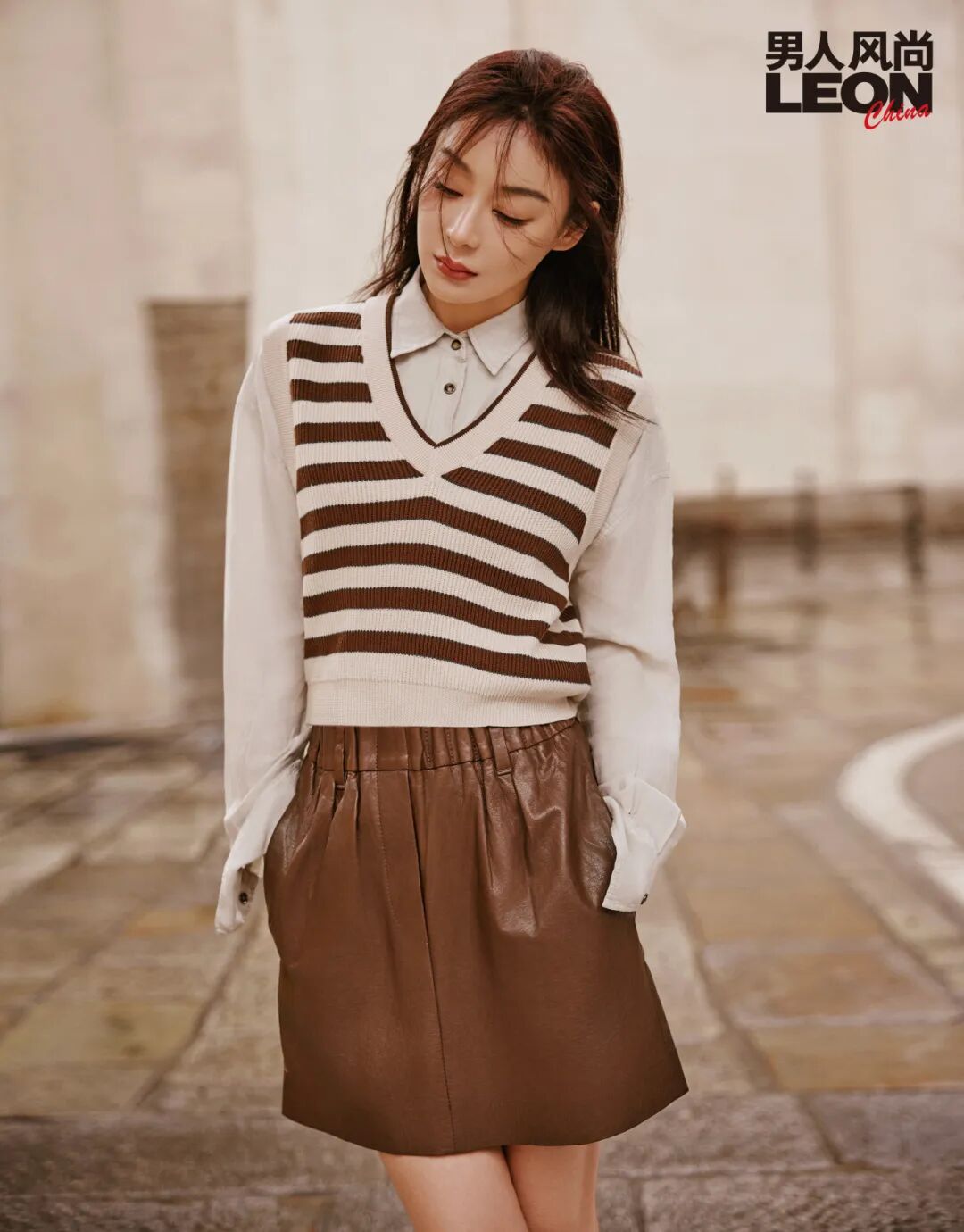 针织条纹背心、亚麻衬衫、皮质半身裙 /