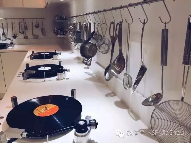玄关左手边是一个厨房,上面挂着各种厨具锅碗瓢盆,料理台上则是唱片。