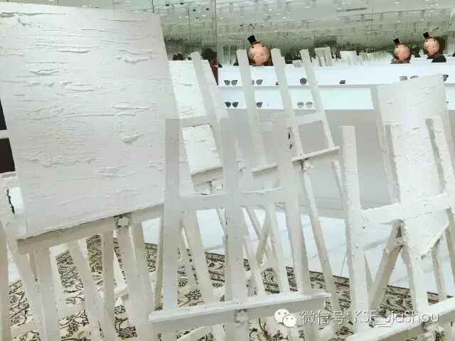 “吊灯”那屋往里走,是另一个房间。中间的地毯上摆满了画架。其他的布局和刚才那屋差不多,也是没边两排开放式货架,上面有大镜子方便看戴上啥样。顺带一提,这屋是墨镜款式最多的一个屋~