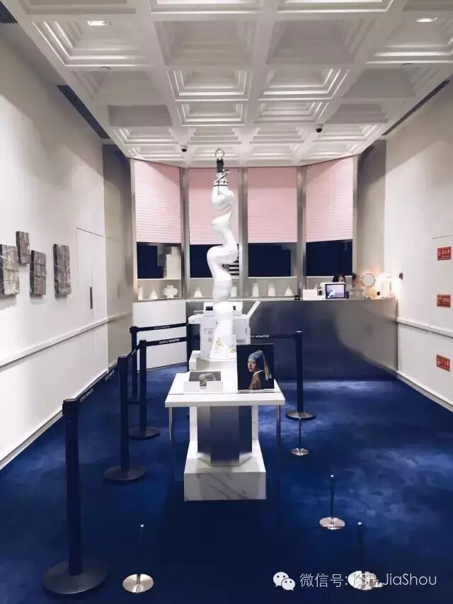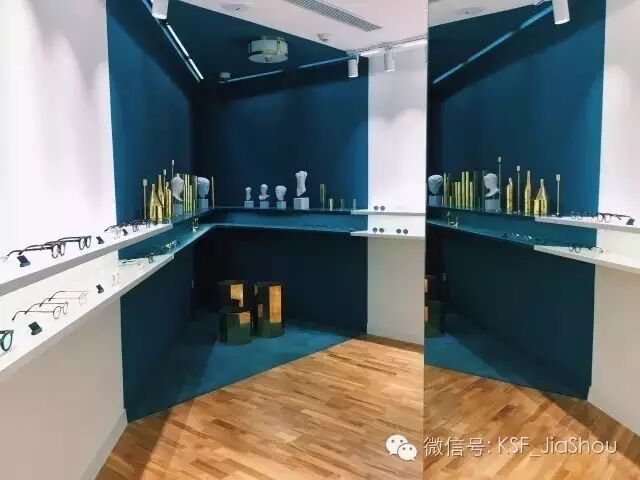 越过休息区就是第三间屋了。这一间被一个由三面大镜子组成的屋中屋分成了三部分。有两条边陈列墨镜,一条边陈列眼镜,角落里还放了各种小石膏像。三面大镜子围起来的屋中屋里,陈列的也是墨镜和眼镜。ps:站在蓝色角落附近对着镜子自拍超酷~
