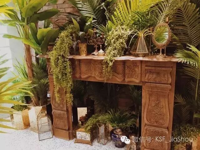 经过一间挂满衣服的小屋,就会看到一个充满热带风情的花园式空间。连壁炉下方都放满了绿植和精致的小摆件。