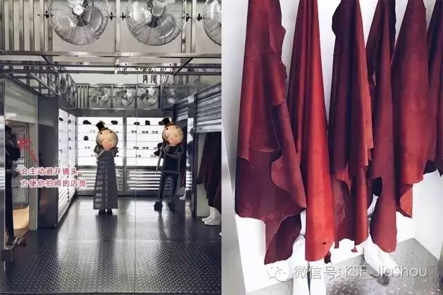 身后有一面大镜子,方便你各种试戴和自拍~另一面墙上挂着进入冷库会用到的围裙(?)和靴子。