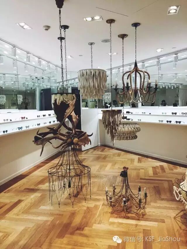 一上楼梯第一间屋是这样哒↓每边两排开放式货架,墨镜随便戴。墨镜上方就是大镜子,随时戴随时看效果,非常方便贴心。房间中间是N个艺术感强烈的“吊灯”。