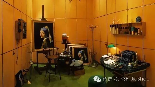 壁炉另一侧的房间,则是艺术家的工作室。整个空间是一种暖黄的色调,别提多复古了。画架和地上都是荷兰画家维米尔的《戴珍珠耳环的少女》。