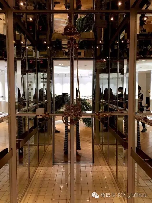 休息区旁边有部电梯。GM店里范主最喜欢的一点就是——到处都是细节。连一部不起眼的电梯,都装上了淋浴喷头,弄成浴室的样子٩(๑❛ᴗ❛๑)۶