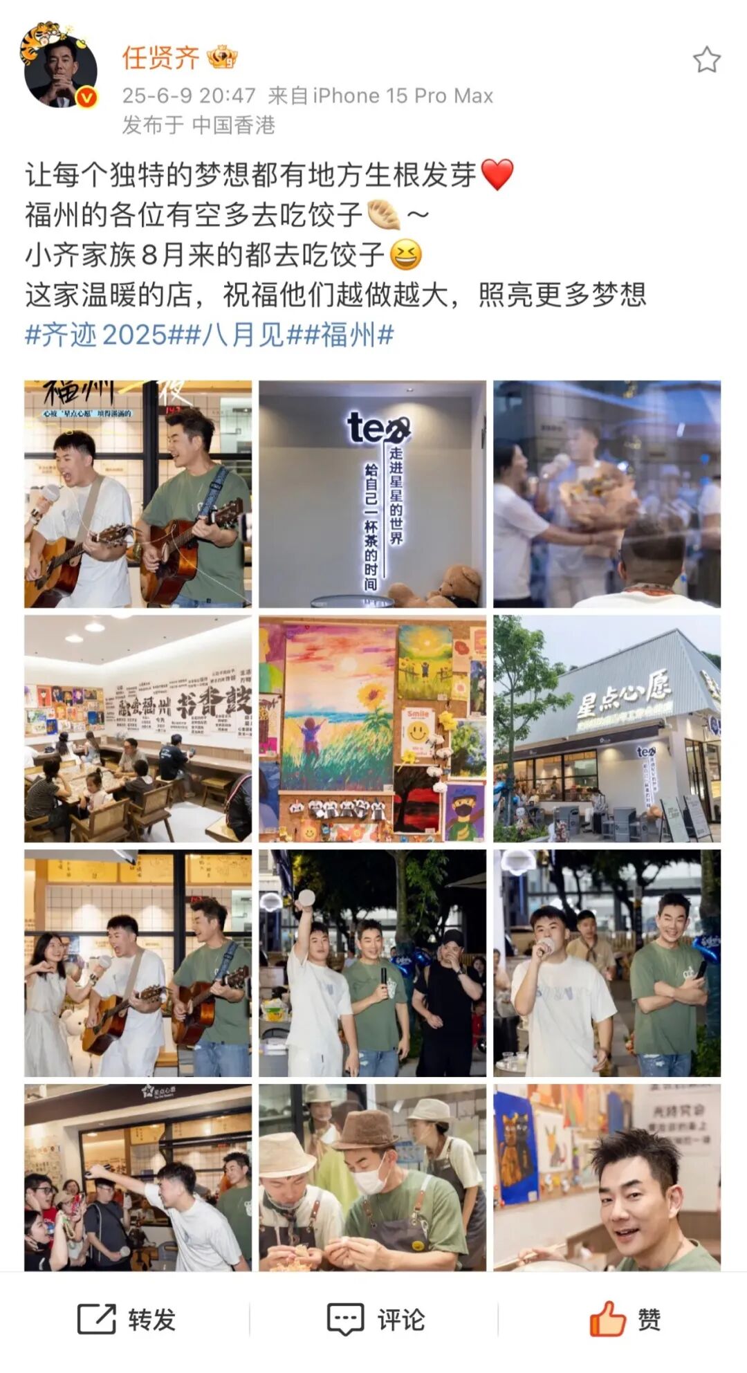就在今晚,任贤齐还在自己的微博上发文,号召大家多去“星点心愿”消费光顾,让这家温暖的店能越做越大,照亮更多梦想。