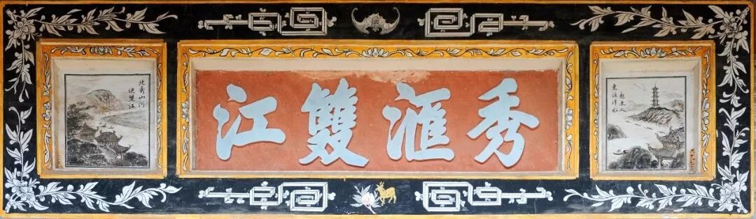 书院右前方为牌坊式门楼,楼高近10米,翘角凌空,脊之两端,堆塑鲤鱼相向倒立,中间塑有葫芦宝瓶。门额上楷书阳刻“潋江书院”四个遒劲大字。进入前庭院,向北登13级石阶来到门庭,这是一栋硬山屋顶的二层楼房,共五间,中为大门,门额上楷书“秀汇双江”,门额左、右分别饰以“东江泮水起人文”“壮秀河山映双江”的彩墨山水画,有潋 、岁二水,波光潋滟,鸟翔天空,鱼游水底,蓝天、白云、绿树、芳野、远山、宝塔,构成了一副精美绝伦的图画。可惜,随着城市建筑的增高,高楼林立,站在门庭前面,再难复此田园风景了!是不幸,还是甚幸?!