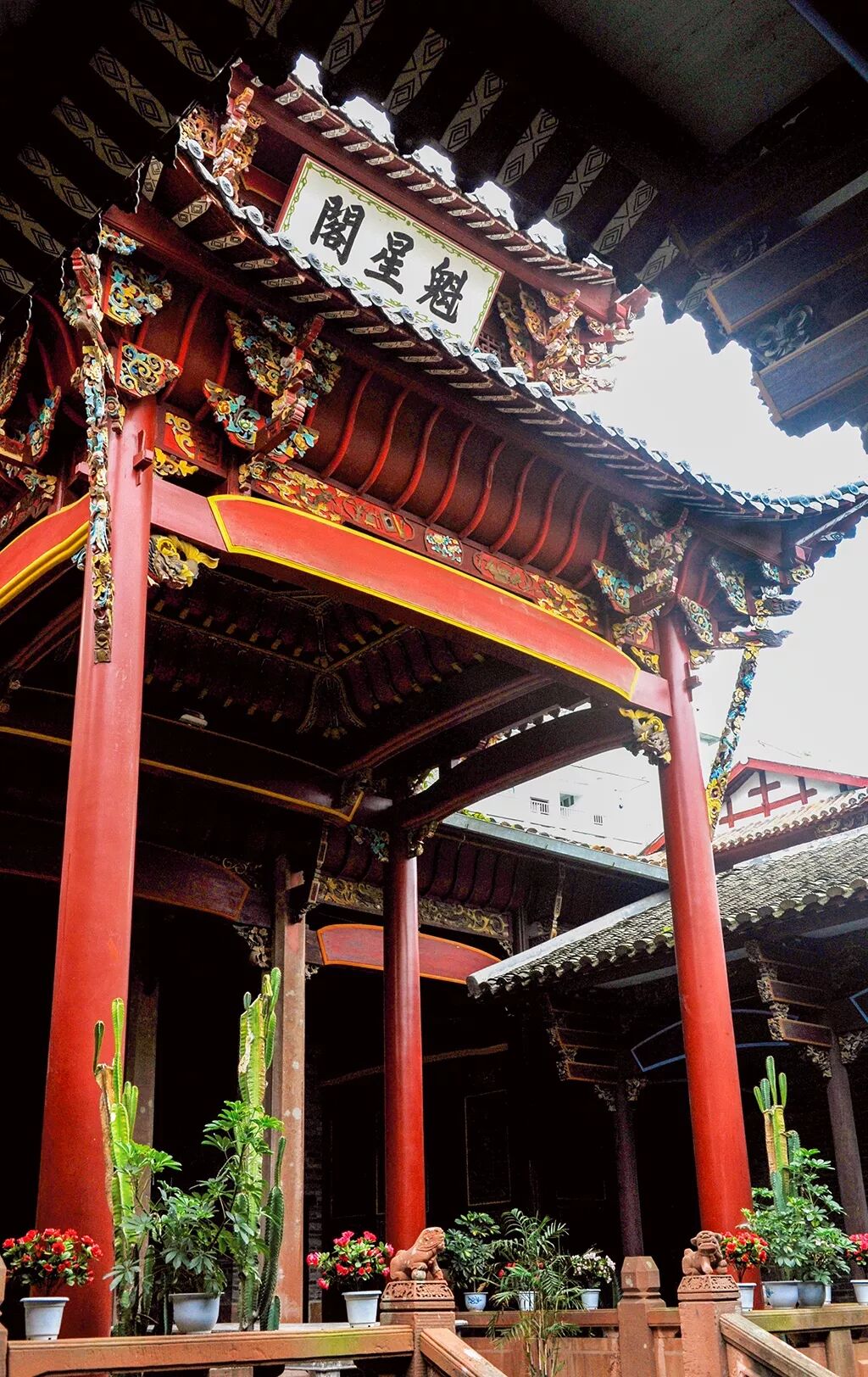 文昌宫魁星阁后,六根红石方柱立于宫中。顶棚正中有藻井,凹面为“龙风呈祥”浮雕。前有檐廊。红石檐柱上原镌有翰林院侍讲钟启峋撰写的对联,联云: