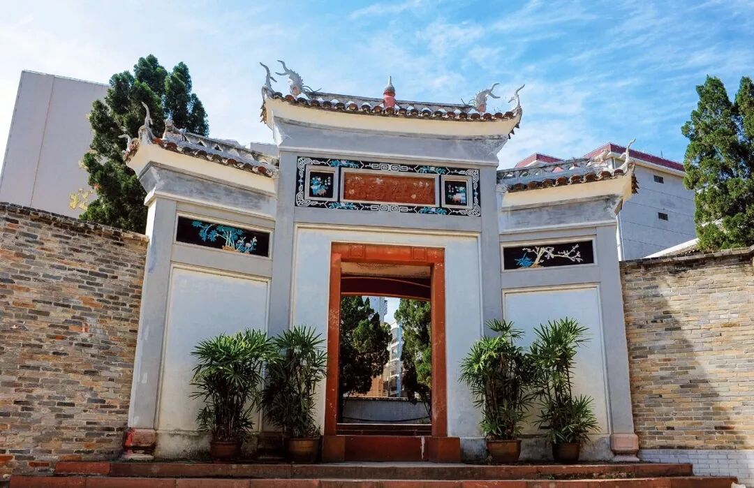 祠前,两栋楼房均糸土木结构,楼房前20米开外,立有四柱三间红石牌坊一座,是为“三程过化”牌坊。牌坊前有石榴、柏树,后有桂树和七色花,一年四季桂花盛开,馥郁芬芳。至夏初,石榴花开,朵朵红艳,春鸟衔草,巢搭其间,鸟鸣枝头,人闲坐看,悠悠然、欣欣然,煞是怡人。