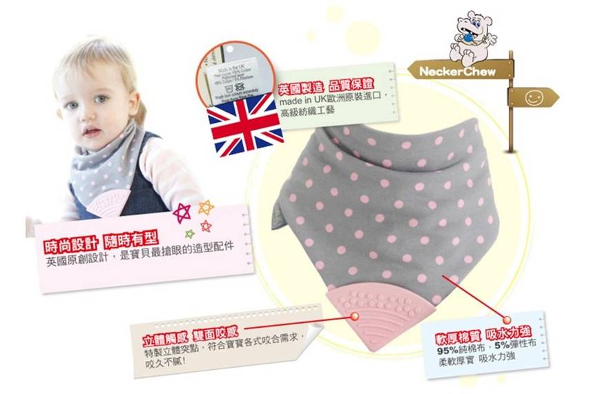 因此,Neckerchew咬咬兜诞生了! 在接下来的9个月中,这两位妈妈,著手进行设计、採购原料、安全测试、品质测试,并在英国当地生产製造。Neckerchew咬咬兜正式上架鲁!
